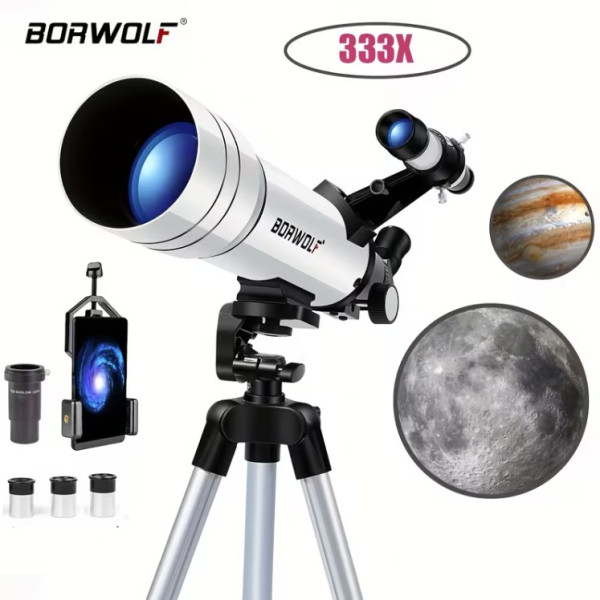 El Borwolf 70/400, que es un telescopio de 70 mm con enfoque manual y una distancia focal de 360 mm. Incluye varios oculares (20 mm, 12 mm y 6 mm), lente Barlow 5X y espejo zenith a 45°, lo que permite probar distintos aumentos y experimentar más. Trae trípode de aluminio ajustable hasta 130 cm, filtro lunar y hasta un clip para celular, ideal si quieren tomar fotos. Es una buena opción para alguien que quiere explorar y jugar con diferentes configuraciones desde el inicio.